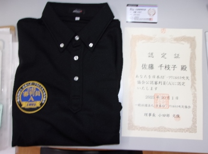 協会より認定証等の一式が届いたのは10月中旬のことです。そこで北広島エルフィン支部の佐藤準師範(南北海道教育部長)のご協力の下、審判員の証を見せて頂きました。取り外しの利くエンブレムが着いたユニフォームまで頂けるんですね。なかなか素敵です↓