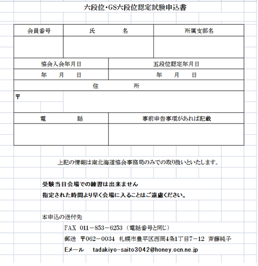 受検を希望される方は、協会の「六段位認定試験受験申請書」に記載の上、工藤ブロック長まで提出してください(5月10日締め切り)。なお、後期6段位検定試験は10月22日(土)を予定しています。